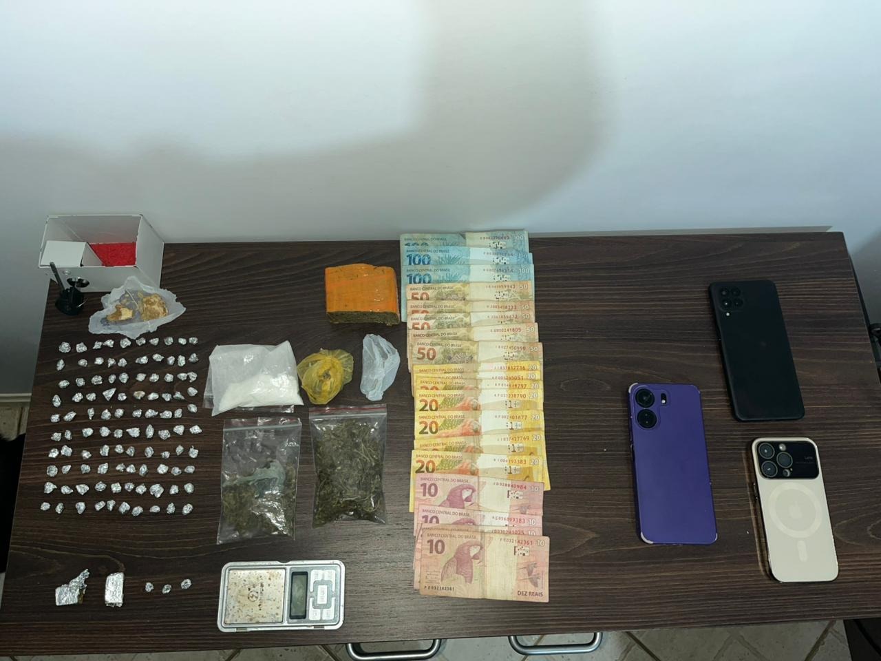 Após o controle da situação, o cão de faro Lugger, da equipe K-9, indicou a presença de entorpecentes escondidos em uma tomada falsa, local onde foram encontradas porções de maconha, crack e cocaína, além de dinheiro e uma balança de precisão.