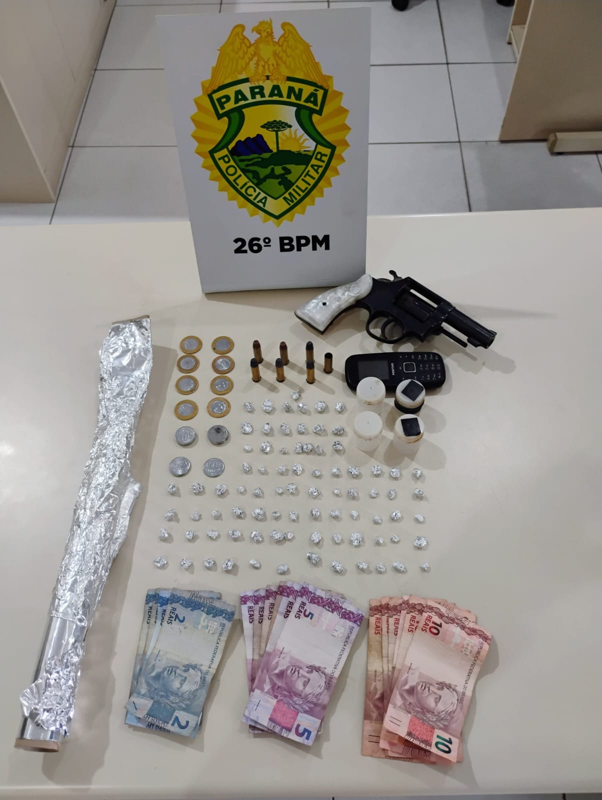 Em buscas, foram localizadas outras 60 pedras de crack, totalizando 81 pedras (aproximadamente 16 gramas), além de um revólver calibre .38, com seis munições intactas e uma deflagrada. Um aparelho celular também foi apreendido.